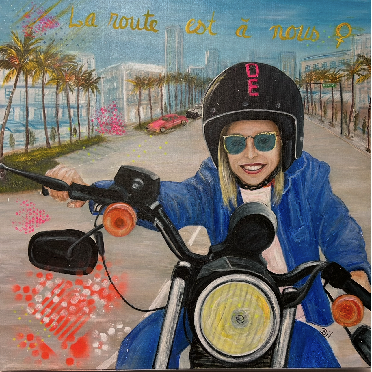 "La route est à nous" - 80 x 80 - acrylique sur toile - de la série Regard de Femmes. Femme sur une Harley Davidson à Miami Beach en Floride. C'est le modèle Sportster comme ma première HD. J'ai prévu de réaliser le même tableau dans un style exotique, un jour... - disponible
