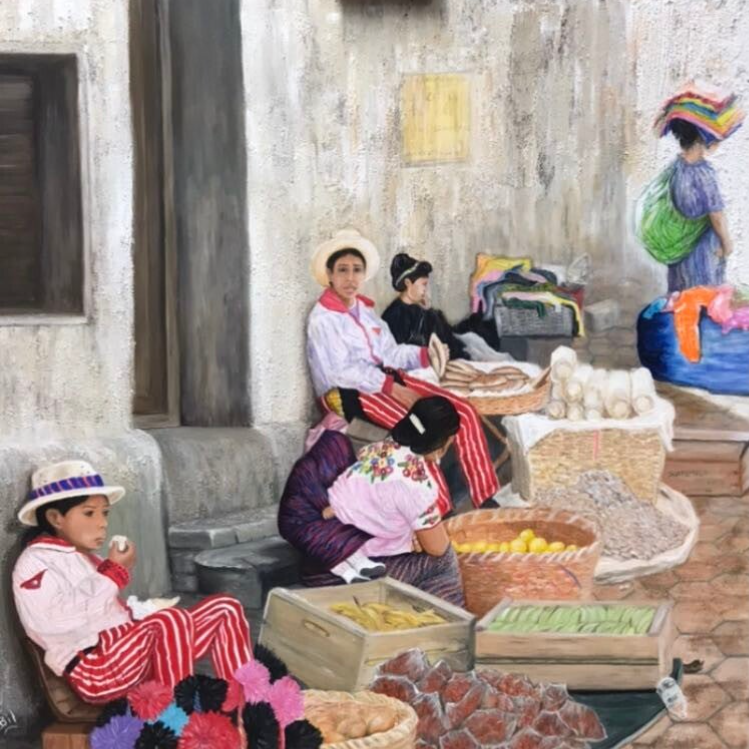 Souvenir d'un voyage au Guatemala en passant par le Bélize et Tobacco Key. Lors d'une escale dans les villes de Panajachel et San Catarina Palopo pour visiter des amis, nous avons acheté l'un de ces fameux Huipil (textile traditionnel maya tissé à la main). Dans cette peinture, j'ai représenté une jeune femme nostalgique, vêtue d'une tenue traditionnelle, qui regarde le volcan sur les hauteurs du lac Atitlan . Cadre bois blanc. disponible