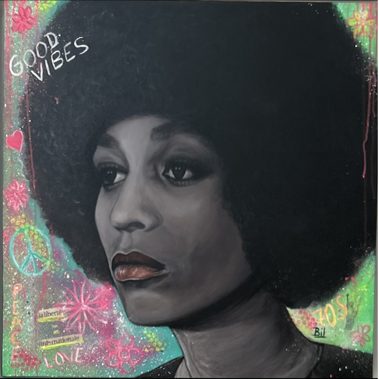 "Angela" - 80 x 80 - acrylique sur toile + autres médiums - de la série Regard de Femmes - sur le thème des seventies - disponible