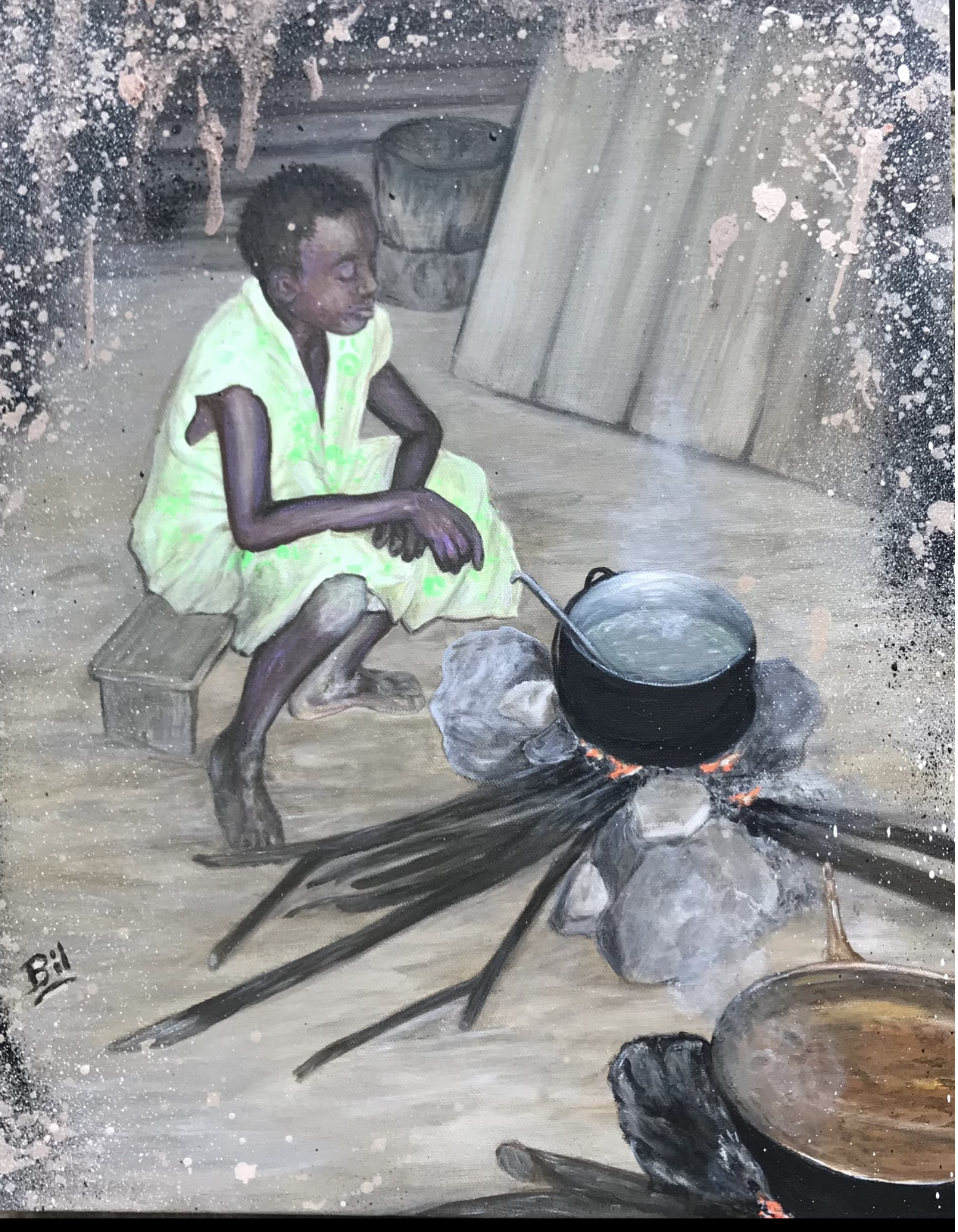 "Petite sénégalaise" - 50 x 40 - acrylique sur toile - J'ai figé sur la toile un moment de préparation du repas à l'intérieur de la case - la monochromie des bruns/sépia servent à décrire l'aspect rudimentaire de la pièce - disponible