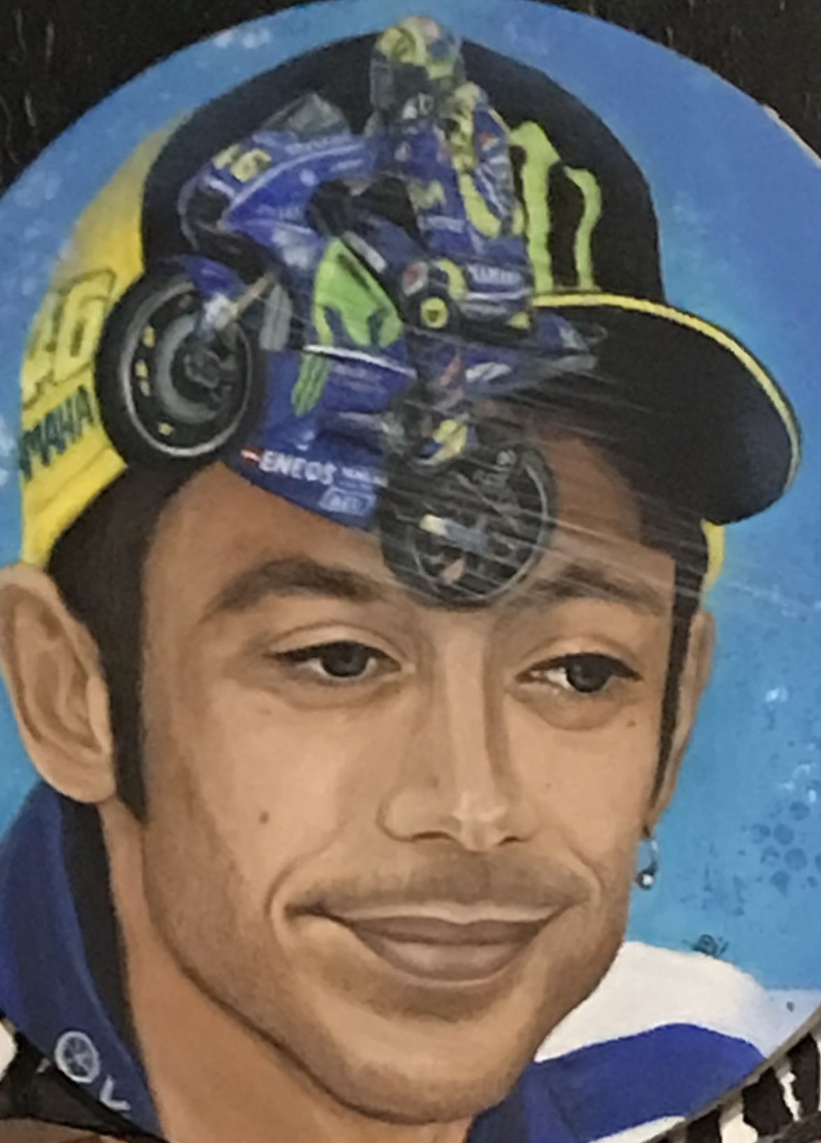 "Val" - diamètre 50 - acrylique + résine sur toile - portrait du pilote de vitesse moto et automobile italien Valentino Rossi. Il a la moto dans la tête. - épuisé