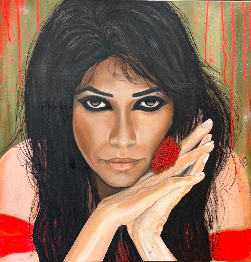 "Yasmin" - 80 x 80 - acrylique + bombe aérosol sur toile : Portrait de la belle Yasmine Levy, chanteuse Israélienne (chant Ladino) dont le répertoire conjugue flamenco et musiques du monde entier. J'ai cherché à immortaliser la profondeur de son regard qui me rappelle chaque fois l'air de "Una noche mas" ma chanson préférée. Dans ce tableau la monochromie du rouge domine et accentue la nostalgie. Cadre bois blanc.