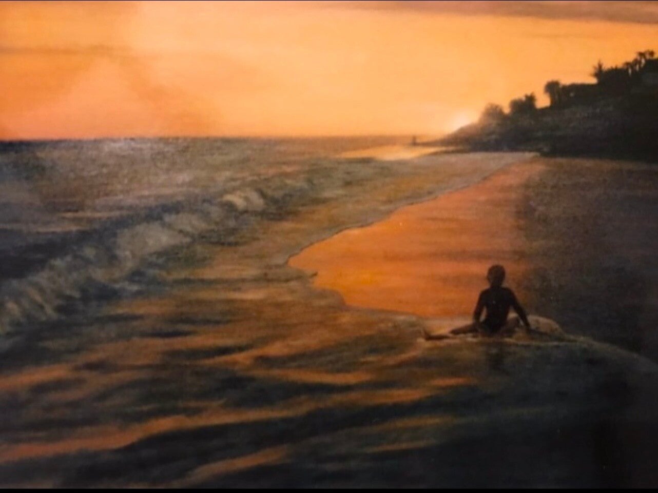 "Plage de Monterrico" -80 x 60 - acrylique sur toile - souvenir d'un voyage au Guatemala - coucher de soleil sur la plage de Monterrico, avec son sable noir et ses gros rouleaux qui troublent l'eau de l'océan. Certainement une des plus belles plages du Guatemala, en tout cas celle la plus appréciée des touristes aujourd'hui. On aperçoit au loin un couple peut-être d'amoureux. - épuisé