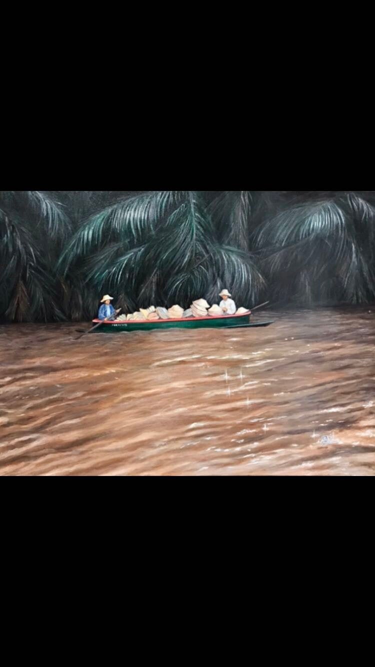 "Marché flottant" - 80 x 60 - acrylique sur toile : souvenir d'un voyage à Bangkok en ces temps où le tourisme de masse n'avait pas l'ampleur d'aujourd'hui. Ma démarche visait la représentation de l'eau boueuse du fleuve et ces vendeurs de chapeaux vus d'une autre embarcation dont on perçoit les remous dans l'eau au premier plan à droite. épuisé